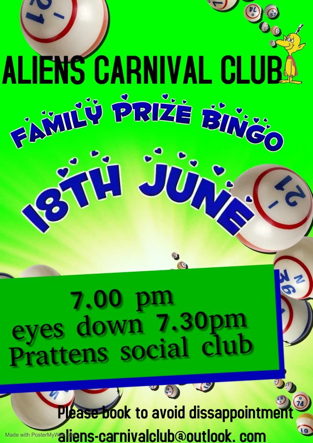 Bingo on Saturday 18th June 2022 Jun 1, 2022 alienscarnivalclub Share this: Click to share on X (Opens in new window) X Click to share on Facebook (Opens in new window) Facebook Like Loading... Related